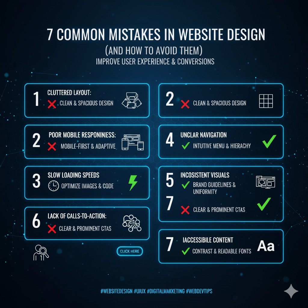 Introduction Even experienced designers make mistakes. Avoid these common pitfalls to ensure your website performs well. 1️⃣ Slow Loading Speed Optimize images, reduce scripts, and use caching to improve speed. 2️⃣ Non-Responsive Design Ensure your site works seamlessly on all devices. 3️⃣ Cluttered Layout Use whitespace and simple navigation to